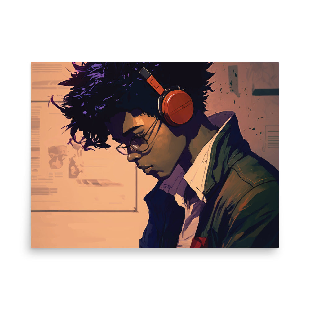 Transform your space with our stunning Afrofuturistic poster, featuring a young man studying while listening to music with wireless headphones on. this poster is the epitome of cool and modern.
